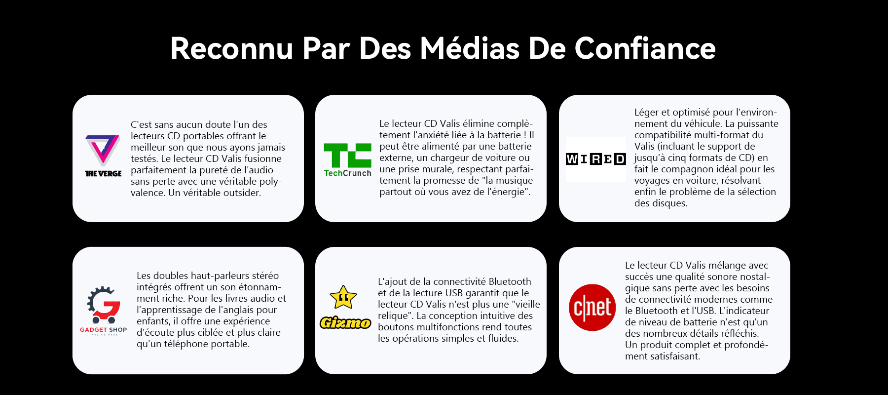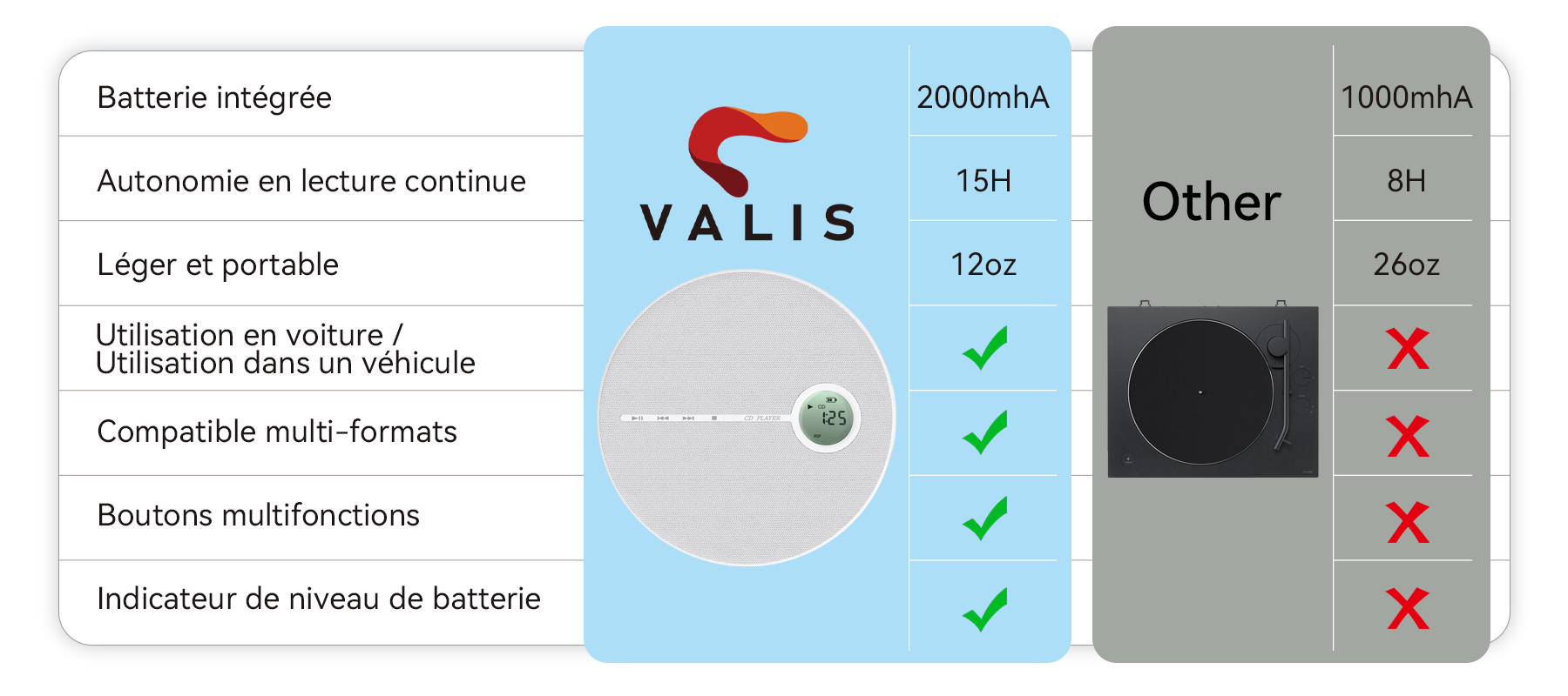 C’est ainsi que Valis a vu le jour. En alliant un design épuré et compact à des fonctionnalités intelligentes, nous permettons à chacun de redécouvrir le plaisir du CD, avec la liberté et la simplicité qu'exige le mode de vie actuel. Vivez la musique, n'importe où, n'importe quand.